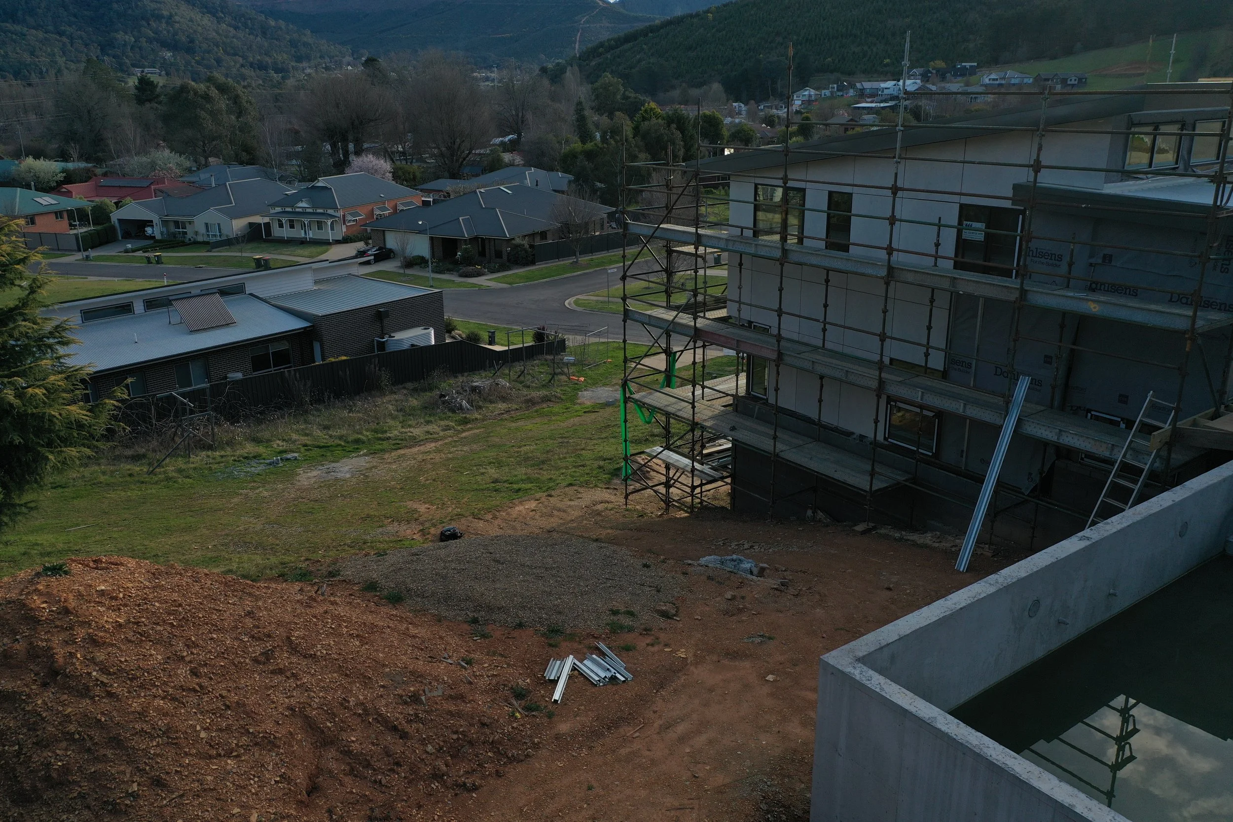 Visitors are welcomed to the front door entry up concrete stairs that float over mass textural plantings and the moving water. The house is stretched out into the landscape softening its imposing height. The front garden spills out to the street front, massed groups of textural plantings, carefully positioned trees to shade from the western sun in coming years, over time the house will be softened and connected to it surroundings.